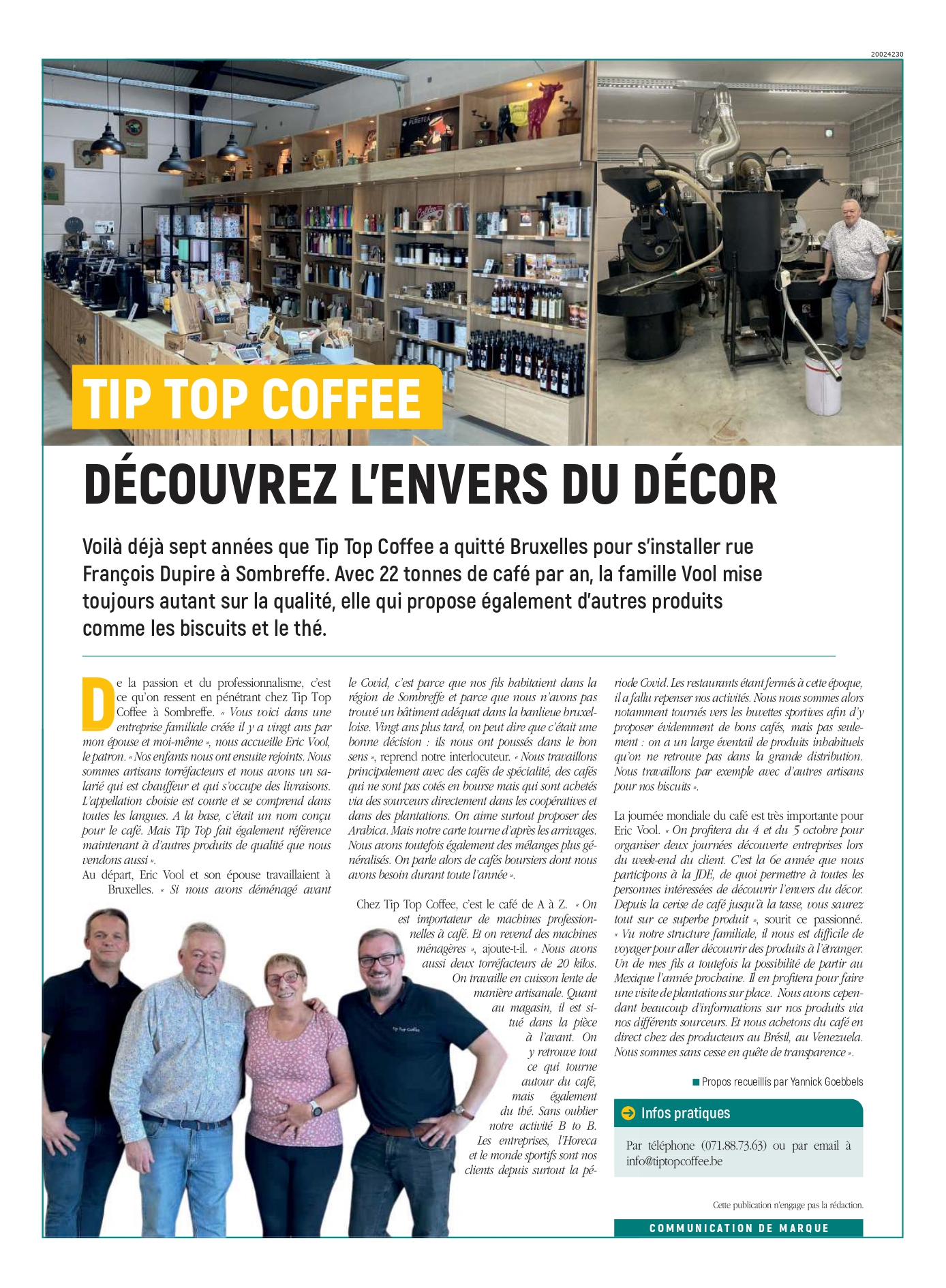 À l’occasion de la Journée mondiale du café, le journal Le 7 Dimanche a consacré un bel article à Tip Top Coffee, notre torréfaction artisanale installée à Sombreffe.